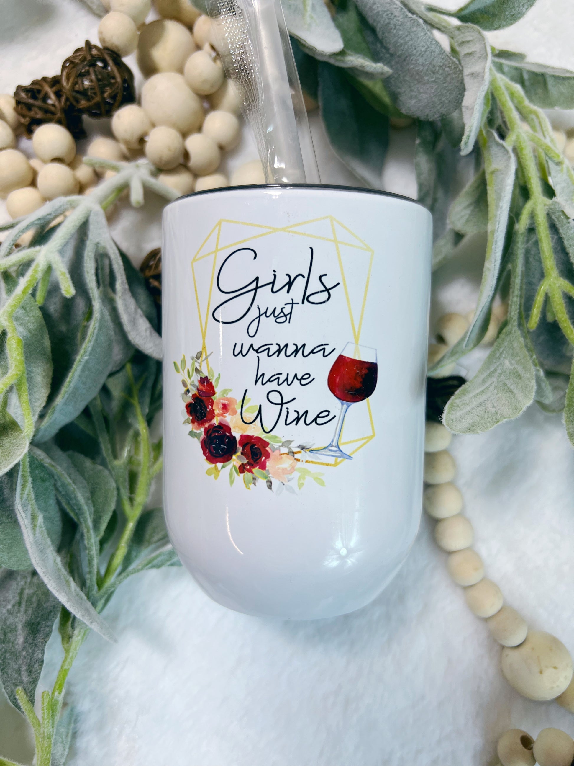 Ready to ship 10 oz wine tumbler. "Girls just wanna have wine".